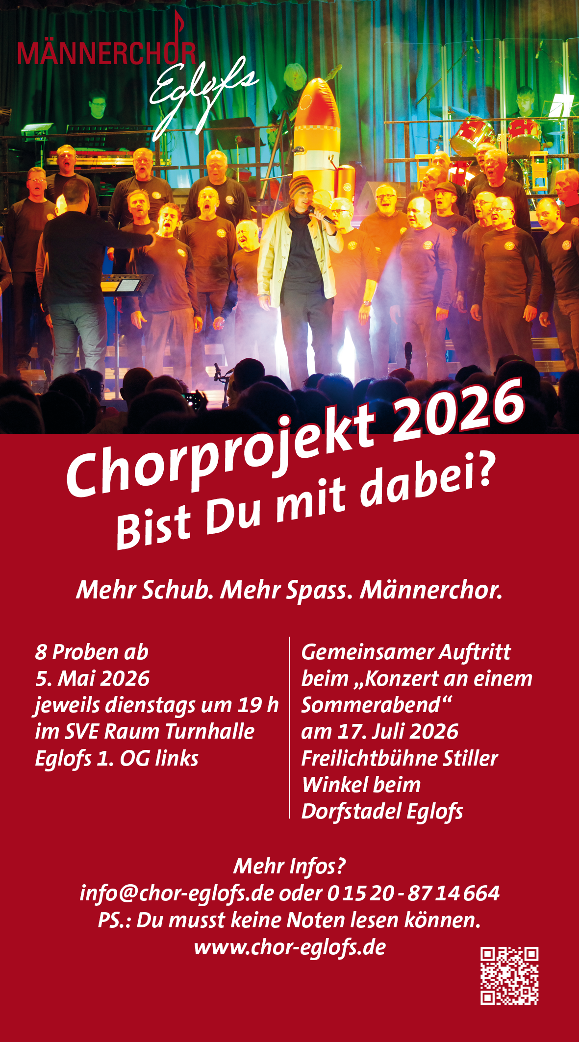 Genau darum startet der Männerchor Eglofs im Mai 2026 ein neues Chorprojekt – und lädt alle Männer ein, die Lust haben, etwas Neues auszuprobieren oder eine alte Leidenschaft wieder aufleben zu lassen.